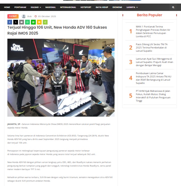 Terjual Hingga 106 Unit, New Honda ADV 160 Sukses Rajai IMOS 2025 by masmul 5 Oktober 2025 in Silahkan kunjungi https://www.suarapemredkalbar.com/read/potret/05102025/terjual-hingga-106-unit-new-honda-adv-160-sukses-rajai-imos-2025. You Might Like Regional Public Launching New ADV160 The SUV Pride Grand Launching New PCX 160 Truly Exceptional! Tetap hati-hati ya bro sist berkendara saat hujan.