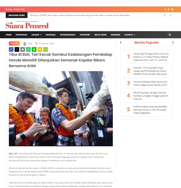 Tiba di Bali, Tari Kecak Sambut Kedatangan Pembalap Honda MotoGP Dilanjutkan Semarak Kopdar Bikers Bersama AHM by masmul 25 Maret 2026 in Silahkan kunjungi https://www.suarapemredkalbar.com/read/potret/25032026/tiba-di-bali-tari-kecak-sambut-kedatangan-pembalap-honda-motogp-dilanjutkan-semarak-kopdar-bikers-bersama-ahm. You Might Like Regional Public Launching New ADV160 The SUV Pride Grand Launching New PCX 160 Truly Exceptional! Tetap hati-hati ya bro sist berkendara saat hujan.