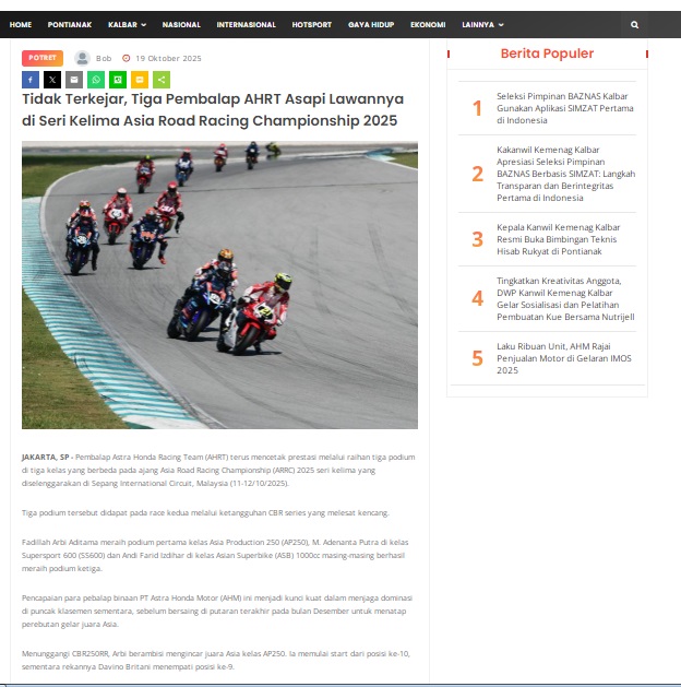 Tidak Terkejar, Tiga Pembalap AHRT Asapi Lawannya di Seri Kelima Asia Road Racing Championship 2025 by masmul 19 Oktober 2025 in Silahkan kunjungi https://www.suarapemredkalbar.com/read/potret/19102025/tidak-terkejar-tiga-pembalap-ahrt-asapi-lawannya-di-seri-kelima-asia-road-racing-championship-2025. You Might Like Regional Public Launching New ADV160 The SUV Pride Grand Launching New PCX 160 Truly Exceptional! Tetap hati-hati ya bro sist berkendara saat hujan.