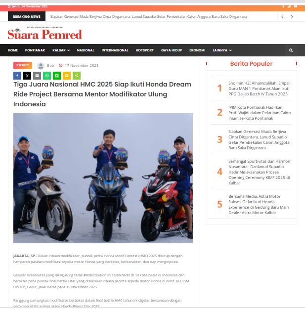 Tiga Juara Nasional HMC 2025 Siap Ikuti Honda Dream Ride Project Bersama Mentor Modifikator Ulung Indonesia by masmul 17 November 2025 in Silahkan kunjungi https://www.suarapemredkalbar.com/read/potret/17112025/tiga-juara-nasional-hmc-2025-siap-ikuti-honda-dream-ride-project-bersama-mentor-modifikator-ulung-indonesia. You Might Like Regional Public Launching New ADV160 The SUV Pride Grand Launching New PCX 160 Truly Exceptional! Tetap hati-hati ya bro sist berkendara saat hujan.