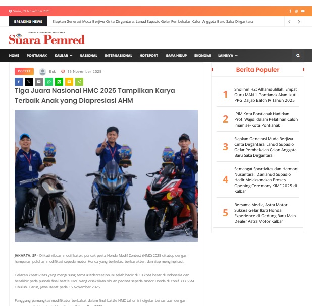 Tiga Juara Nasional HMC 2025 Tampilkan Karya Terbaik Anak yang Diapresiasi AHM by masmul 16 November 2025 in Silahkan kunjungi https://www.suarapemredkalbar.com/read/potret/16112025/tiga-juara-nasional-hmc-2025-tampilkan-karya-terbaik-anak-yang-diapresiasi-ahm. You Might Like Regional Public Launching New ADV160 The SUV Pride Grand Launching New PCX 160 Truly Exceptional! Tetap hati-hati ya bro sist berkendara saat hujan.
