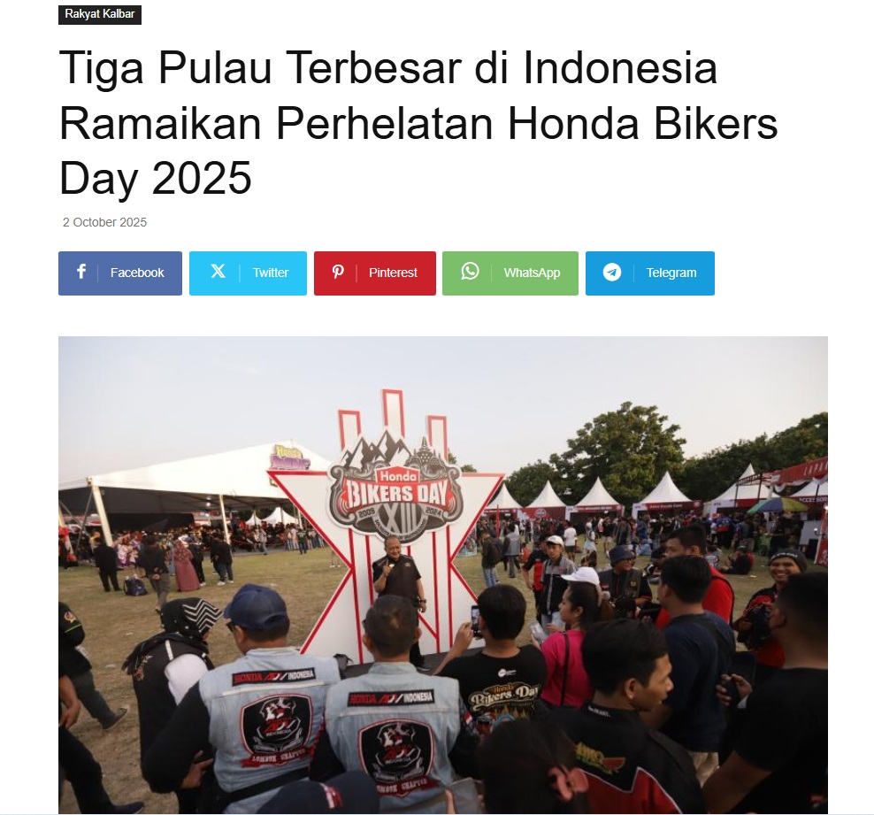 Tiga Pulau Terbesar di Indonesia Ramaikan Perhelatan Honda Bikers Day 2025 by Nova Sari 2 Oktober 2025 in Silahkan kunjungi https://equator.co.id/tiga-pulau-terbesar-di-indonesia-ramaikan-perhelatan-honda-bikers-day-2025/. You Might Like Regional Public Launching New ADV160 The SUV Pride Grand Launching New PCX 160 Truly Exceptional! Tetap hati-hati ya bro sist berkendara saat hujan.