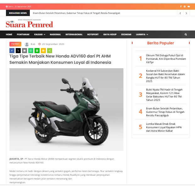 Tiga Tipe Terbaik New Honda ADV160 dari Pt AHM Semakin Manjakan Konsumen Loyal di Indonesia by masmul 20 September 2025 in Silahkan kunjungi https://www.suarapemredkalbar.com/read/potret/20092025/tiga-tipe-terbaik-new-honda-adv160-dari-pt-ahm-semakin-manjakan-konsumen-loyal-di-indonesia. You Might Like Regional Public Launching New ADV160 The SUV Pride Grand Launching New PCX 160 Truly Exceptional! Tetap hati-hati ya bro sist berkendara saat hujan.