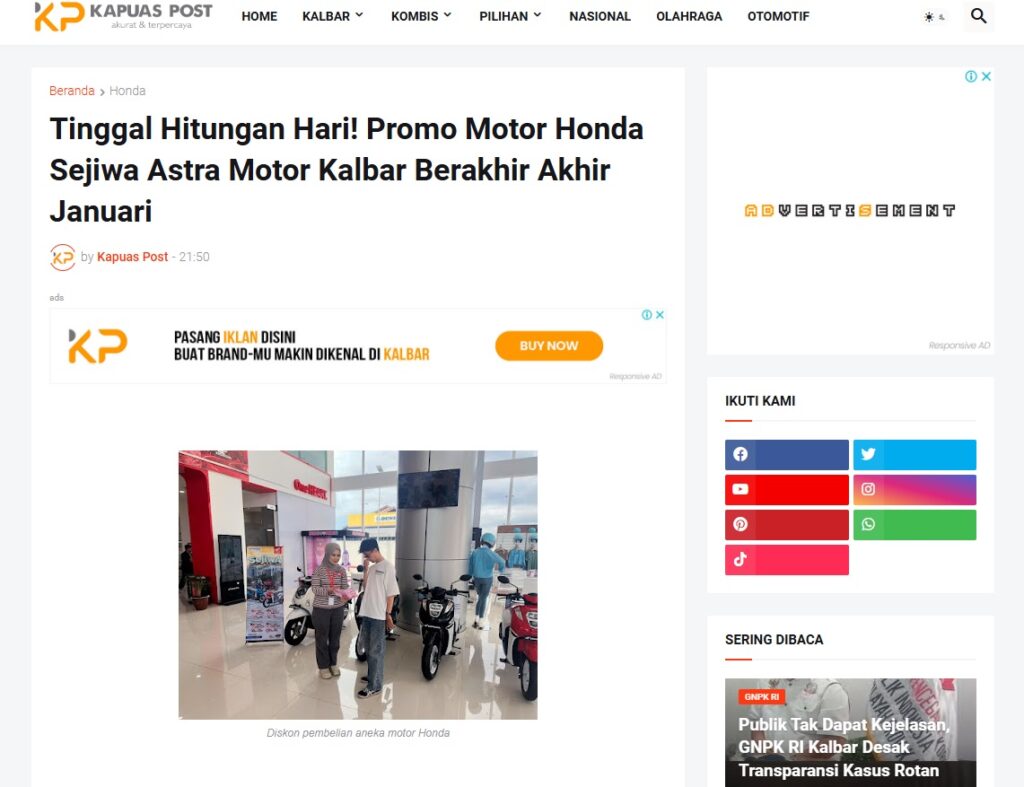Tinggal Hitungan Hari! Promo Motor Honda Sejiwa Astra Motor Kalbar Berakhir Akhir Januari by Muhammad Arif 29 Januari 2026 in Silahkan kunjungi https://www.kapuaspost.web.id/2026/01/tinggal-hitungan-hari-promo-motor-honda.html. Tags: astra Astra Motor kalbar Astra Motor Pontianak astramotor honda kalbar pontianak sepeda motor You Might Like Regional Public Launching New ADV160 The SUV Pride Grand Launching New PCX 160 Truly Exceptional! Tetap hati-hati ya bro sist berkendara saat hujan.