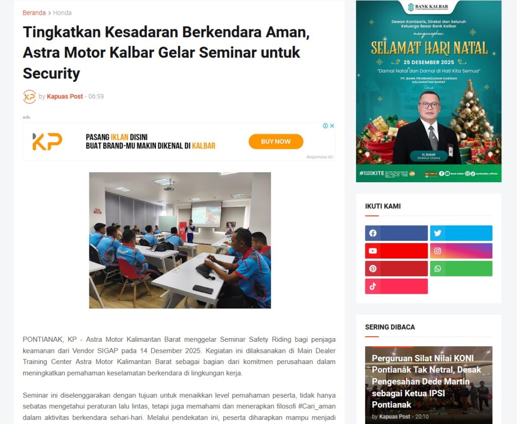 Tingkatkan Kesadaran Berkendara Aman, Astra Motor Kalbar Gelar Seminar untuk Security by Muhammad Arif 28 Desember 2025 in Silahkan kunjungi https://www.kapuaspost.web.id/2025/12/tingkatkan-kesadaran-berkendara-aman.html. Tags: astra Astra Motor kalbar Astra Motor Pontianak astramotor honda kalbar pontianak sepeda motor You Might Like Regional Public Launching New ADV160 The SUV Pride Grand Launching New PCX 160 Truly Exceptional! Tetap hati-hati ya bro sist berkendara saat hujan.