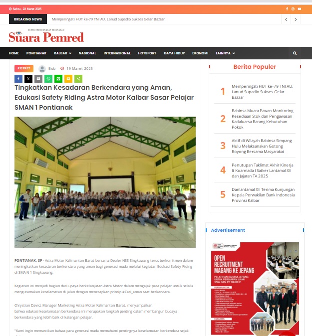 Tingkatkan Kesadaran Berkendara yang Aman, Edukasi Safety Riding Astra Motor Kalbar Sasar Pelajar SMAN 1 Pontianak by masmul 19 Maret 2025 in Silahkan kunjungi https://www.suarapemredkalbar.com/read/potret/19032025/tingkatkan-kesadaran-berkendara-yang-aman-edukasi-safety-riding-astra-motor-kalbar-sasar-pelajar-sman-1-pontianak. You Might Like Regional Public Launching New ADV160 The SUV Pride Grand Launching New PCX 160 Truly Exceptional! Tetap hati-hati ya bro sist berkendara saat hujan.