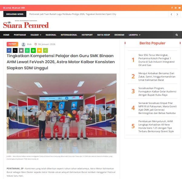 Tingkatkan Kompetensi Pelajar dan Guru SMK Binaan AHM Lewat FeVosh 2026, Astra Motor Kalbar Konsisten Siapkan SDM Unggul by masmul 6 Januari 2026 in Silahkan kunjungi https://www.suarapemredkalbar.com/read/potret/06012026/tingkatkan-kompetensi-pelajar-dan-guru-smk-binaan-ahm-lewat-fevosh-2026-astra-motor-kalbar-konsisten-siapkan-sdm-unggul. You Might Like Regional Public Launching New ADV160 The SUV Pride Grand Launching New PCX 160 Truly Exceptional! Tetap hati-hati ya bro sist berkendara saat hujan.