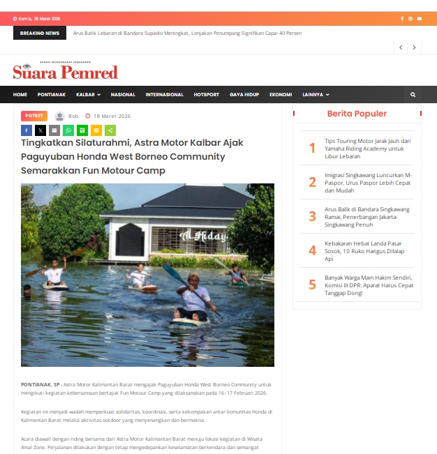 Tingkatkan Silaturahmi, Astra Motor Kalbar Ajak Paguyuban Honda West Borneo Community Semarakkan Fun Motour Camp by masmul 18 Maret 2026 in Silahkan kunjungi https://www.suarapemredkalbar.com/read/potret/18032026/tingkatkan-silaturahmi-astra-motor-kalbar-ajak-paguyuban-honda-west-borneo-community-semarakkan-fun-motour-camp. You Might Like Regional Public Launching New ADV160 The SUV Pride Grand Launching New PCX 160 Truly Exceptional! Tetap hati-hati ya bro sist berkendara saat hujan.