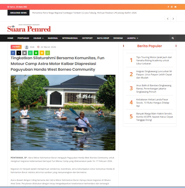 Tingkatkan Silaturahmi Bersama Komunitas, Fun Motour Camp Astra Motor Kalbar Diapresiasi Paguyuban Honda West Borneo Community by masmul 22 Maret 2026 in Silahkan kunjungi https://www.suarapemredkalbar.com/read/potret/22032026/tingkatkan-silaturahmi-bersama-komunitas-fun-motour-camp-astra-motor-kalbar-diapresiasi-paguyuban-honda-west-borneo-community. You Might Like Regional Public Launching New ADV160 The SUV Pride Grand Launching New PCX 160 Truly Exceptional! Tetap hati-hati ya bro sist berkendara saat hujan.