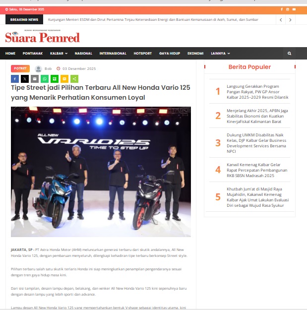 Tipe Street jadi Pilihan Terbaru All New Honda Vario 125 yang Menarik Perhatian Konsumen Loyal by masmul 3 Desember 2025 in Silahkan kunjungi https://www.suarapemredkalbar.com/read/potret/03122025/tipe-street-jadi-pilihan-terbaru-all-new-honda-vario-125-yang-menarik-perhatian-konsumen-loyal. You Might Like Regional Public Launching New ADV160 The SUV Pride Grand Launching New PCX 160 Truly Exceptional! Tetap hati-hati ya bro sist berkendara saat hujan.
