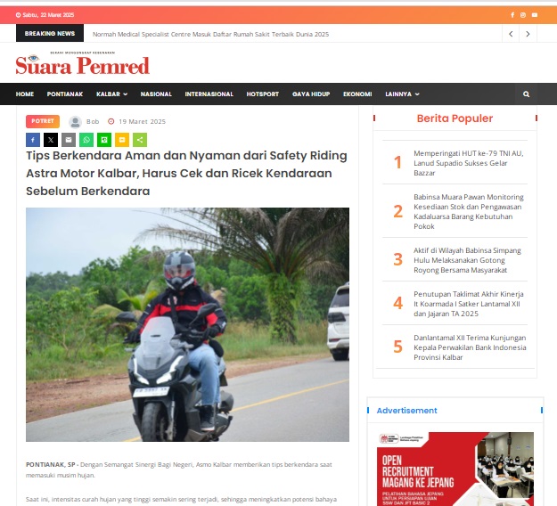 Tips Berkendara Aman dan Nyaman dari Safety Riding Astra Motor Kalbar, Harus Cek dan Ricek Kendaraan Sebelum Berkendara by masmul 19 Maret 2025 in Silahkan kunjungi https://www.suarapemredkalbar.com/read/potret/19032025/tips-berkendara-aman-dan-nyaman-dari-safety-riding-astra-motor-kalbar-harus-cek-dan-ricek-kendaraan-sebelum-berkendara. You Might Like Regional Public Launching New ADV160 The SUV Pride Grand Launching New PCX 160 Truly Exceptional! Tetap hati-hati ya bro sist berkendara saat hujan.