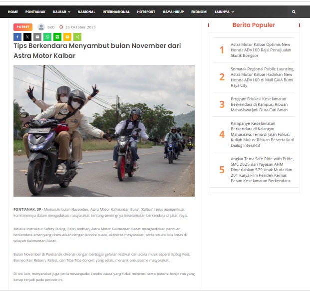Tips Berkendara Menyambut bulan November dari Astra Motor Kalbar by masmul 25 Oktober 2025 in Silahkan kunjungi https://www.suarapemredkalbar.com/read/potret/25102025/tips-berkendara-menyambut-bulan-november-dari-astra-motor-kalbar. You Might Like Regional Public Launching New ADV160 The SUV Pride Grand Launching New PCX 160 Truly Exceptional! Tetap hati-hati ya bro sist berkendara saat hujan.