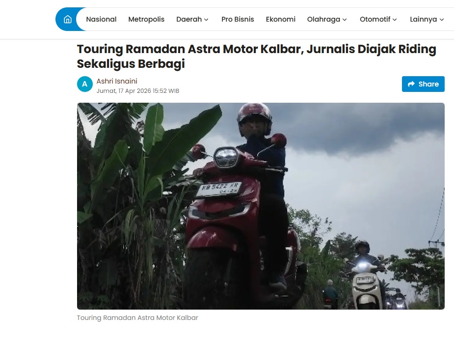Touring Ramadan Astra Motor Kalbar, Jurnalis Diajak Riding Sekaligus Berbagi by Aristono Edi Kiswantoro 17 April 2026 in Silahkan kunjungi https://pontianakpost.jawapos.com/otomotif/2604170066/touring-ramadan-astra-motor-kalbar-jurnalis-diajak-riding-sekaligus-berbagi. You Might Like Regional Public Launching New ADV160 The SUV Pride Grand Launching New PCX 160 Truly Exceptional! Tetap hati-hati ya bro sist berkendara saat hujan.