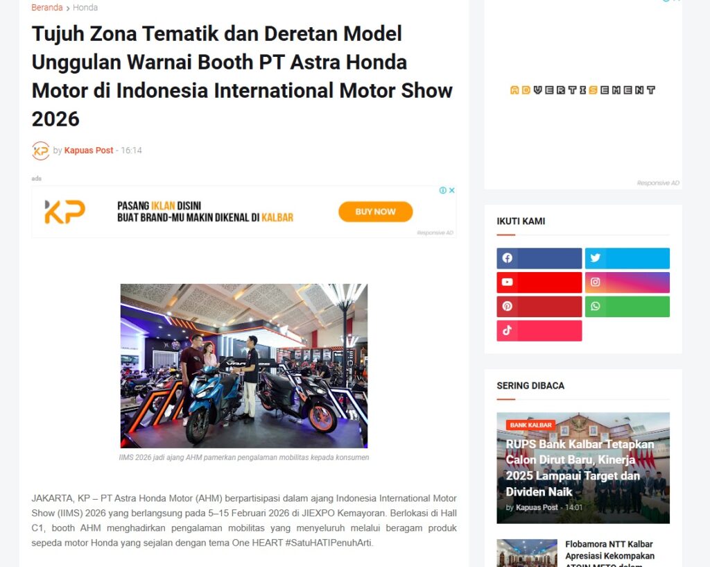 Tujuh Zona Tematik dan Deretan Model Unggulan Warnai Booth PT Astra Honda Motor di Indonesia International Motor Show 2026 by Muhammad Arif 13 Februari 2026 in Silahkan kunjungi https://www.kapuaspost.web.id/2026/02/tujuh-zona-tematik-dan-deretan-model.html. Tags: astra Astra Motor kalbar Astra Motor Pontianak astramotor honda kalbar pontianak sepeda motor You Might Like Regional Public Launching New ADV160 The SUV Pride Grand Launching New PCX 160 Truly Exceptional! Tetap hati-hati ya bro sist berkendara saat hujan.