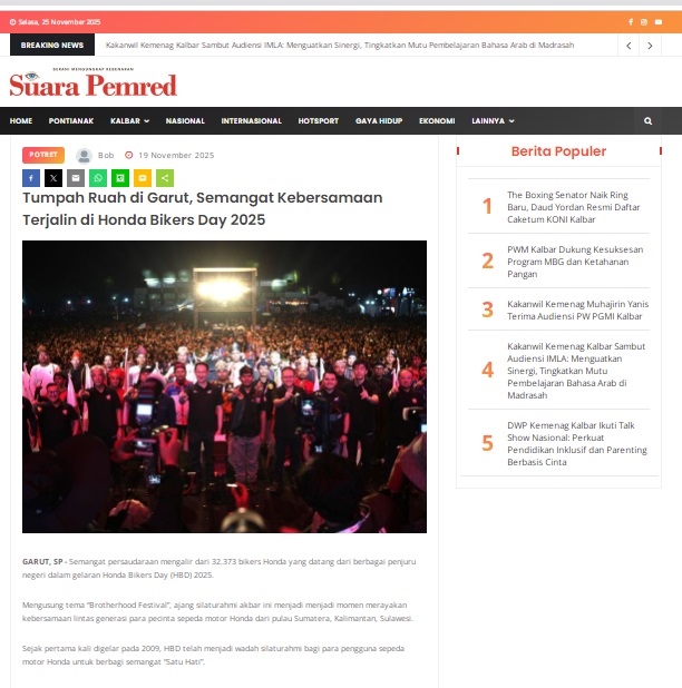 Tumpah Ruah di Garut, Semangat Kebersamaan Terjalin di Honda Bikers Day 2025 by masmul 19 November 2025 in Silahkan kunjungi https://www.suarapemredkalbar.com/read/potret/19112025/tumpah-ruah-di-garut-semangat-kebersamaan-terjalin-di-honda-bikers-day-2025. You Might Like Regional Public Launching New ADV160 The SUV Pride Grand Launching New PCX 160 Truly Exceptional! Tetap hati-hati ya bro sist berkendara saat hujan.