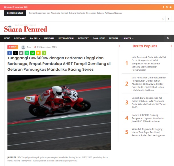 Tunggangi CBR600RR dengan Performa Tinggi dan Bertenaga, Empat Pembalap AHRT Tampil Gemilang di Gelaran Pamungkas Mandalika Racing Series by masmul 5 November 2025 in Silahkan kunjungi https://www.suarapemredkalbar.com/read/potret/05112025/tunggangi-cbr600rr-dengan-performa-tinggi-dan-bertenaga-empat-pembalap-ahrt-tampil-gemilang-di-gelaran-pamungkas-mandalika-racing-series. You Might Like Regional Public Launching New ADV160 The SUV Pride Grand Launching New PCX 160 Truly Exceptional! Tetap hati-hati ya bro sist berkendara saat hujan.