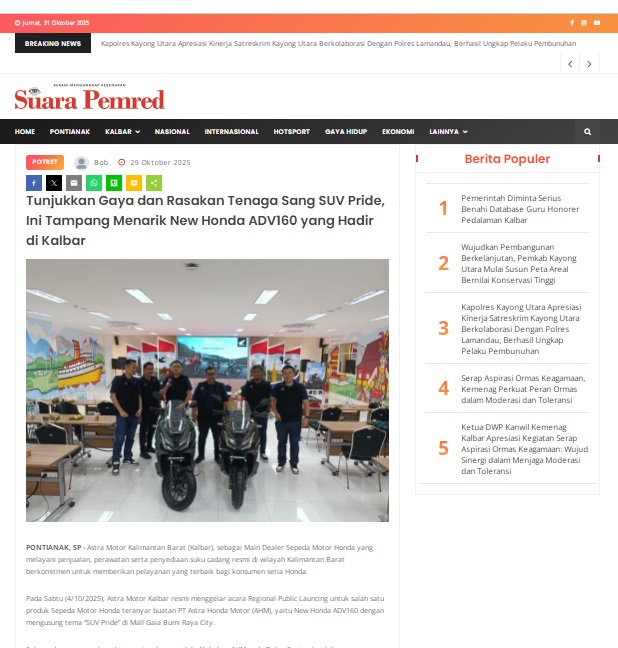 Tunjukkan Gaya dan Rasakan Tenaga Sang SUV Pride, Ini Tampang Menarik New Honda ADV160 yang Hadir di Kalbar by masmul 29 Oktober 2025 in Silahkan kunjungi https://www.suarapemredkalbar.com/read/potret/29102025/tunjukkan-gaya-dan-rasakan-tenaga-sang-suv-pride-ini-tampang-menarik-new-honda-adv160-yang-hadir-di-kalbar. You Might Like Regional Public Launching New ADV160 The SUV Pride Grand Launching New PCX 160 Truly Exceptional! Tetap hati-hati ya bro sist berkendara saat hujan.