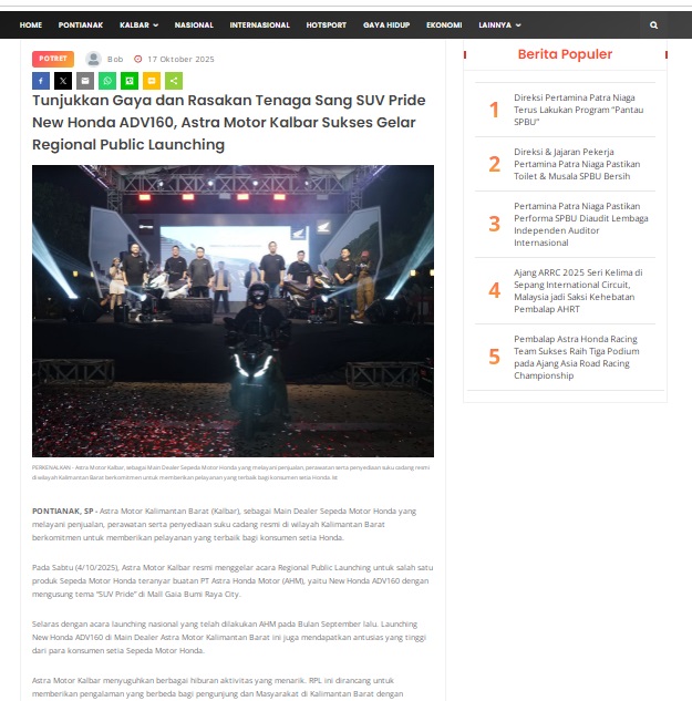 Tunjukkan Gaya dan Rasakan Tenaga Sang SUV Pride New Honda ADV160, Astra Motor Kalbar Sukses Gelar Regional Public Launching by masmul 17 Oktober 2025 in Silahkan kunjungi https://www.suarapemredkalbar.com/read/potret/17102025/tunjukkan-gaya-dan-rasakan-tenaga-sang-suv-pride-new-honda-adv160-astra-motor-kalbar-sukses-gelar-regional-public-launching. You Might Like Regional Public Launching New ADV160 The SUV Pride Grand Launching New PCX 160 Truly Exceptional! Tetap hati-hati ya bro sist berkendara saat hujan.