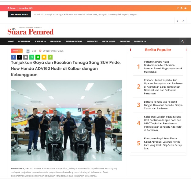 Tunjukkan Gaya dan Rasakan Tenaga Sang SUV Pride, New Honda ADV160 Hadir di Kalbar dengan Kebanggaan by masmul 9 November 2025 in Silahkan kunjungi https://www.suarapemredkalbar.com/read/potret/09112025/tunjukkan-gaya-dan-rasakan-tenaga-sang-suv-pride-new-honda-adv160-hadir-di-kalbar-dengan-kebanggaan. You Might Like Regional Public Launching New ADV160 The SUV Pride Grand Launching New PCX 160 Truly Exceptional! Tetap hati-hati ya bro sist berkendara saat hujan.