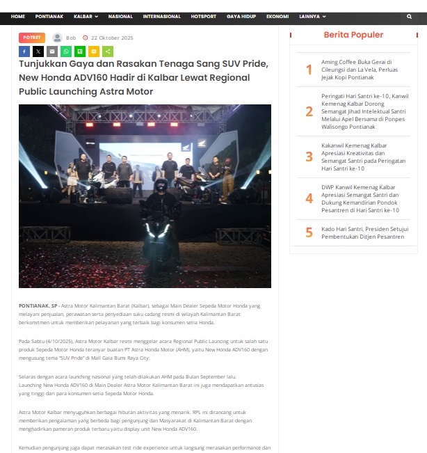 Tunjukkan Gaya dan Rasakan Tenaga Sang SUV Pride, New Honda ADV160 Hadir di Kalbar Lewat Regional Public Launching Astra Motor by masmul 22 Oktober 2025 in Silahkan kunjungi https://www.suarapemredkalbar.com/read/potret/22102025/tunjukkan-gaya-dan-rasakan-tenaga-sang-suv-pride-new-honda-adv160-hadir-di-kalbar-lewat-regional-public-launching-astra-motor. You Might Like Regional Public Launching New ADV160 The SUV Pride Grand Launching New PCX 160 Truly Exceptional! Tetap hati-hati ya bro sist berkendara saat hujan.