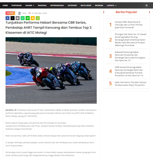 Tunjukkan Performa Hebart Bersama CBR Series, Pembalap AHRT Tampil Kencang dan Tembus Top 3 Klasemen di IATC Motegi by masmul 22 Oktober 2025 in Silahkan kunjungi https://www.suarapemredkalbar.com/read/potret/22102025/tunjukkan-performa-hebart-bersama-cbr-series-pembalap-ahrt-tampil-kencang-dan-tembus-top-3-klasemen-di-iatc-motegi. You Might Like Regional Public Launching New ADV160 The SUV Pride Grand Launching New PCX 160 Truly Exceptional! Tetap hati-hati ya bro sist berkendara saat hujan.