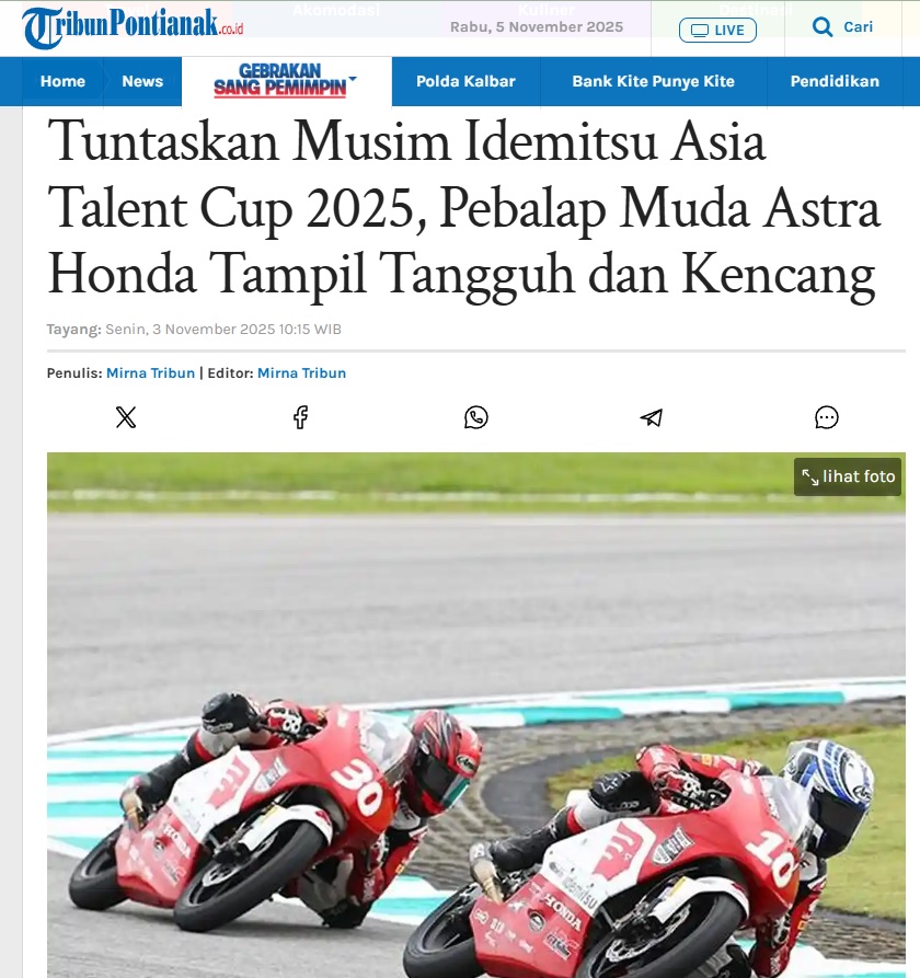 Tuntaskan Musim Idemitsu Asia Talent Cup 2025, Pebalap Muda Astra Honda Tampil Tangguh dan Kencang by Ishak Ismail 3 November 2025 in Silahkan kunjungi https://pontianak.tribunnews.com/otomotif/1148391/tuntaskan-musim-idemitsu-asia-talent-cup-2025-pebalap-muda-astra-honda-tampil-tangguh-dan-kencang. You Might Like Regional Public Launching New ADV160 The SUV Pride Grand Launching New PCX 160 Truly Exceptional! Tetap hati-hati ya bro sist berkendara saat hujan.