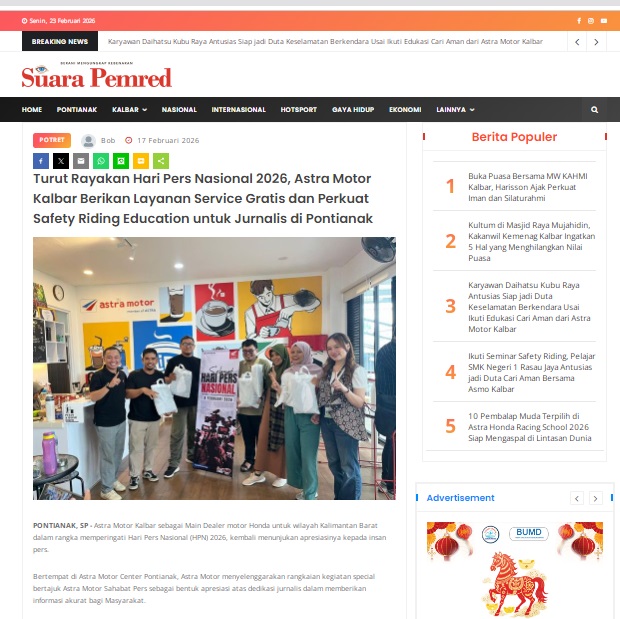Turut Rayakan Hari Pers Nasional 2026, Astra Motor Kalbar Berikan Layanan Service Gratis dan Perkuat Safety Riding Education untuk Jurnalis di Pontianak by masmul 17 Februari 2026 in Silahkan kunjungi https://www.suarapemredkalbar.com/read/potret/17022026/turut-rayakan-hari-pers-nasional-2026-astra-motor-kalbar-berikan-layanan-service-gratis-dan-perkuat-safety-riding-education-untuk-jurnalis-di-pontianak. You Might Like Regional Public Launching New ADV160 The SUV Pride Grand Launching New PCX 160 Truly Exceptional! Tetap hati-hati ya bro sist berkendara saat hujan.