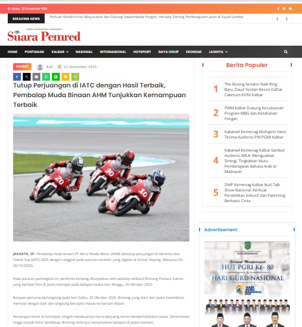 Tutup Perjuangan di IATC dengan Hasil Terbaik, Pembalap Muda Binaan AHM Tunjukkan Kemampuan Terbaik by masmul 22 November 2025 in Silahkan kunjungi https://www.suarapemredkalbar.com/read/potret/22112025/tutup-perjuangan-di-iatc-dengan-hasil-terbaik-pembalap-muda-binaan-ahm-tunjukkan-kemampuan-terbaik. You Might Like Regional Public Launching New ADV160 The SUV Pride Grand Launching New PCX 160 Truly Exceptional! Tetap hati-hati ya bro sist berkendara saat hujan.