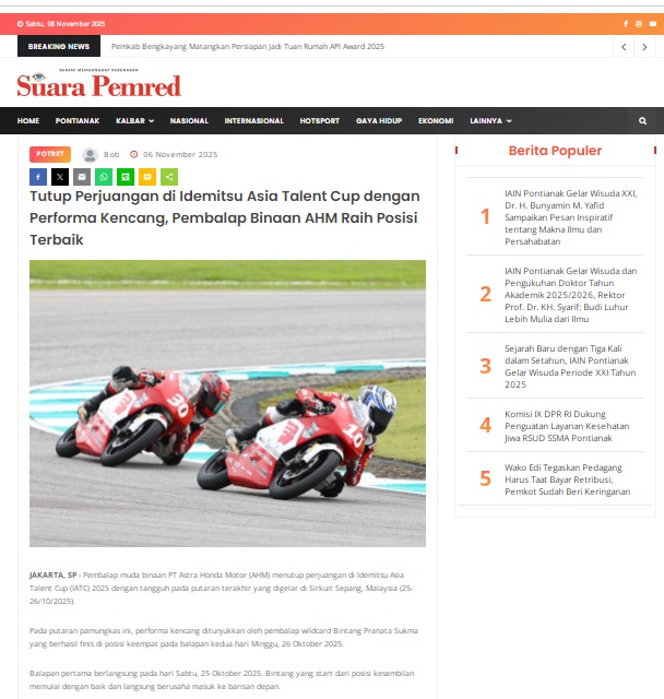 Tutup Perjuangan di Idemitsu Asia Talent Cup dengan Performa Kencang, Pembalap Binaan AHM Raih Posisi Terbaik by masmul 6 November 2025 in Silahkan kunjungi https://www.suarapemredkalbar.com/read/potret/06112025/tutup-perjuangan-di-idemitsu-asia-talent-cup-dengan-performa-kencang-pembalap-binaan-ahm-raih-posisi-terbaik. You Might Like Regional Public Launching New ADV160 The SUV Pride Grand Launching New PCX 160 Truly Exceptional! Tetap hati-hati ya bro sist berkendara saat hujan.