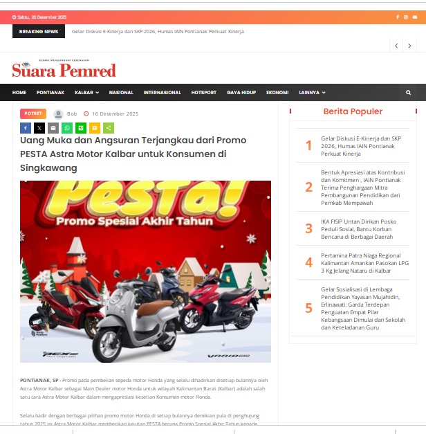 Uang Muka dan Angsuran Terjangkau dari Promo PESTA Astra Motor Kalbar untuk Konsumen di Singkawang by masmul 16 Desember 2025 in Silahkan kunjungi https://www.suarapemredkalbar.com/read/potret/16122025/uang-muka-dan-angsuran-terjangkau-dari-promo-pesta-astra-motor-kalbar-untuk-konsumen-di-singkawang. You Might Like Regional Public Launching New ADV160 The SUV Pride Grand Launching New PCX 160 Truly Exceptional! Tetap hati-hati ya bro sist berkendara saat hujan.