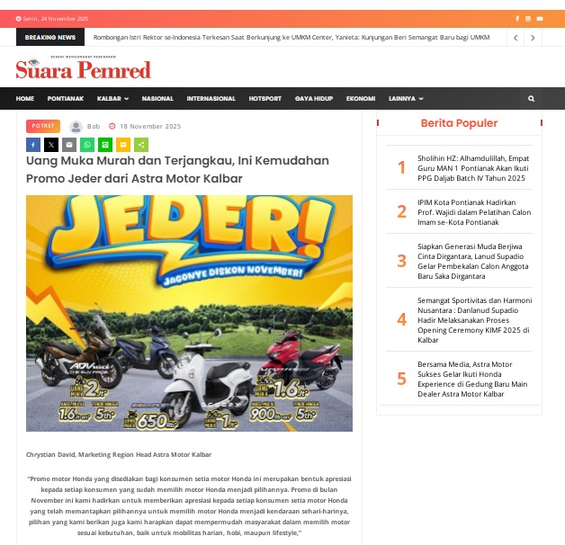 Uang Muka Murah dan Terjangkau, Ini Kemudahan Promo Jeder dari Astra Motor Kalbar by masmul 18 November 2025 in Silahkan kunjungi https://www.suarapemredkalbar.com/read/potret/18112025/uang-muka-murah-dan-terjangkau-ini-kemudahan-promo-jeder-dari-astra-motor-kalbar. You Might Like Regional Public Launching New ADV160 The SUV Pride Grand Launching New PCX 160 Truly Exceptional! Tetap hati-hati ya bro sist berkendara saat hujan.