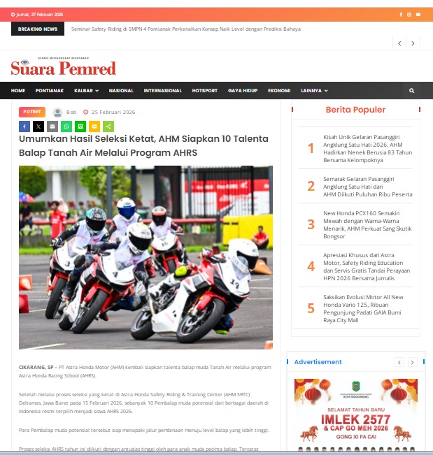 Umumkan Hasil Seleksi Ketat, AHM Siapkan 10 Talenta Balap Tanah Air Melalui Program AHRS by masmul 25 Februari 2026 in Silahkan kunjungi https://www.suarapemredkalbar.com/read/potret/25022026/umumkan-hasil-seleksi-ketat-ahm-siapkan-10-talenta-balap-tanah-air-melalui-program-ahrs. You Might Like Regional Public Launching New ADV160 The SUV Pride Grand Launching New PCX 160 Truly Exceptional! Tetap hati-hati ya bro sist berkendara saat hujan.