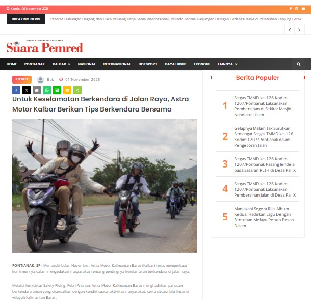 Untuk Keselamatan Berkendara di Jalan Raya, Astra Motor Kalbar Berikan Tips Berkendara Bersama by masmul 1 November 2025 in Silahkan kunjungi https://www.suarapemredkalbar.com/read/potret/01112025/untuk-keselamatan-berkendara-di-jalan-raya-astra-motor-kalbar-berikan-tips-berkendara-bersama. You Might Like Regional Public Launching New ADV160 The SUV Pride Grand Launching New PCX 160 Truly Exceptional! Tetap hati-hati ya bro sist berkendara saat hujan.