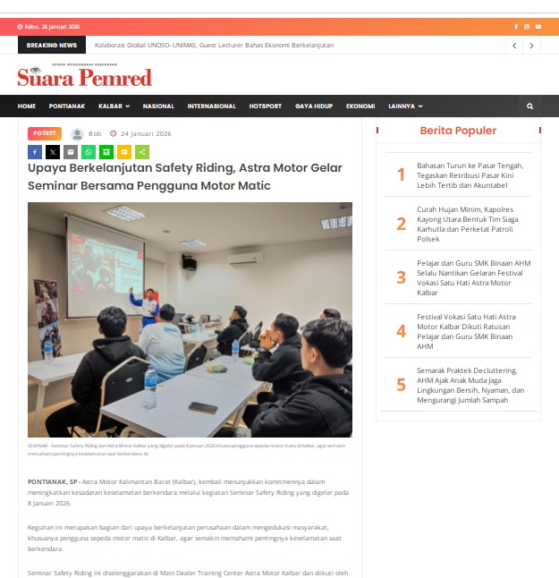 Upaya Berkelanjutan Safety Riding, Astra Motor Gelar Seminar Bersama Pengguna Motor Matic by masmul 24 Januari 2026 in Silahkan kunjungi https://www.suarapemredkalbar.com/read/potret/24012026/upaya-berkelanjutan-safety-riding-astra-motor-gelar-seminar-bersama-pengguna-motor-matic. You Might Like Regional Public Launching New ADV160 The SUV Pride Grand Launching New PCX 160 Truly Exceptional! Tetap hati-hati ya bro sist berkendara saat hujan.