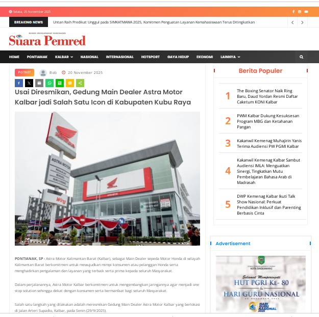 Usai Diresmikan, Gedung Main Dealer Astra Motor Kalbar jadi Salah Satu Icon di Kabupaten Kubu Raya by masmul 20 November 2025 in Silahkan kunjungi https://www.suarapemredkalbar.com/read/potret/20112025/usai-diresmikan-gedung-main-dealer-astra-motor-kalbar-jadi-salah-satu-icon-di-kabupaten-kubu-raya. You Might Like Regional Public Launching New ADV160 The SUV Pride Grand Launching New PCX 160 Truly Exceptional! Tetap hati-hati ya bro sist berkendara saat hujan.