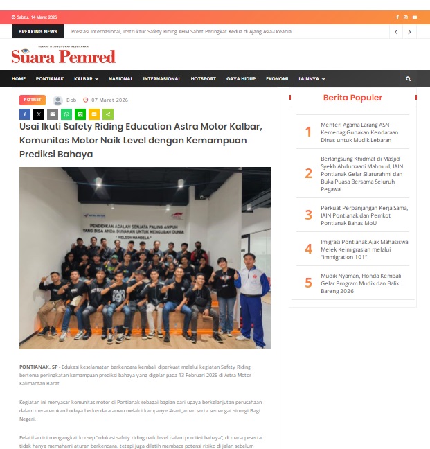 Usai Ikuti Safety Riding Education Astra Motor Kalbar, Komunitas Motor Naik Level dengan Kemampuan Prediksi Bahaya by masmul 7 Maret 2026 in Silahkan kunjungi https://www.suarapemredkalbar.com/read/potret/07032026/usai-ikuti-safety-riding-education-astra-motor-kalbar-komunitas-motor-naik-level-dengan-kemampuan-prediksi-bahaya. You Might Like Regional Public Launching New ADV160 The SUV Pride Grand Launching New PCX 160 Truly Exceptional! Tetap hati-hati ya bro sist berkendara saat hujan.