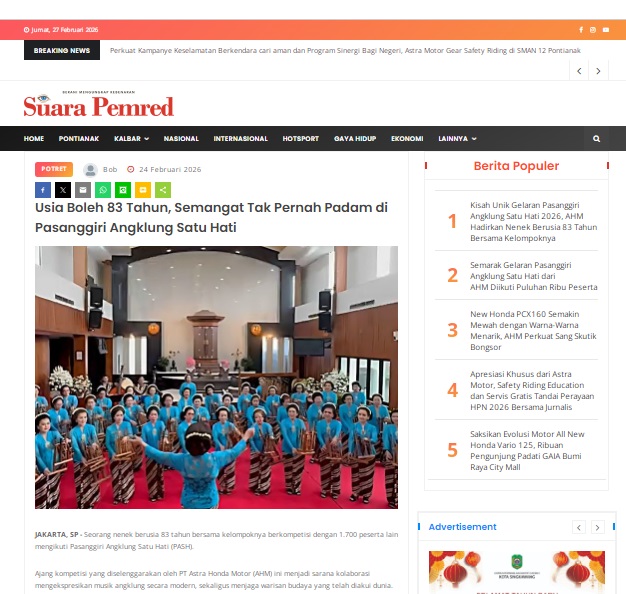 Usia Boleh 83 Tahun, Semangat Tak Pernah Padam di Pasanggiri Angklung Satu Hati by masmul 24 Februari 2026 in Silahkan kunjungi https://www.suarapemredkalbar.com/read/potret/24022026/usia-boleh-83-tahun-semangat-tak-pernah-padam-di-pasanggiri-angklung-satu-hati. You Might Like Regional Public Launching New ADV160 The SUV Pride Grand Launching New PCX 160 Truly Exceptional! Tetap hati-hati ya bro sist berkendara saat hujan.