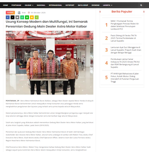 Usung Konsep Modern dan Multifungsi, Ini Semarak Peresmian Gedung Main Dealer Astra Motor Kalbar by masmul 5 Oktober 2025 in Silahkan kunjungi https://www.suarapemredkalbar.com/read/potret/05102025/usung-konsep-modern-dan-multifungsi-ini-semarak-peresmian-gedung-main-dealer-astra-motor-kalbar. You Might Like Regional Public Launching New ADV160 The SUV Pride Grand Launching New PCX 160 Truly Exceptional! Tetap hati-hati ya bro sist berkendara saat hujan.