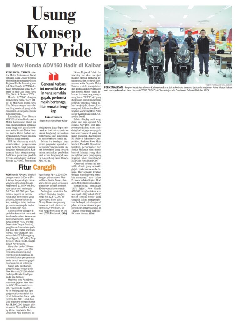 Usung Konsep SUV Pride – New Honda ADV160 Hadir di Kalbar by Ishak Ismail 6 Oktober 2025 in Silahkan buka . You Might Like Regional Public Launching New ADV160 The SUV Pride Grand Launching New PCX 160 Truly Exceptional! Tetap hati-hati ya bro sist berkendara saat hujan.