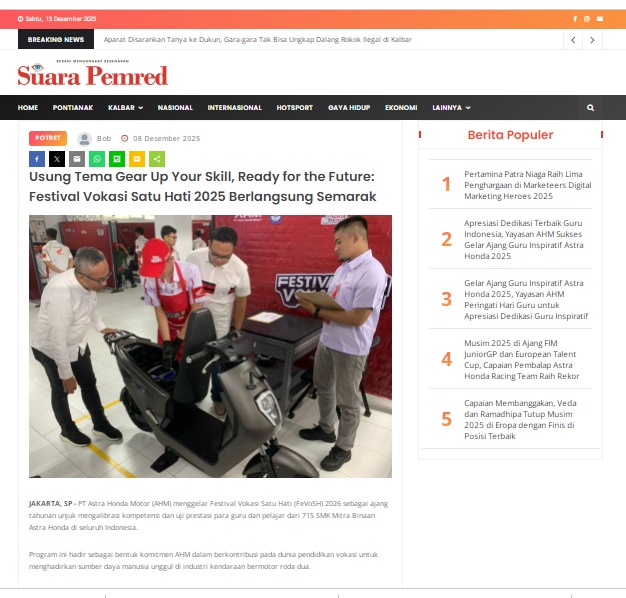 Usung Tema Gear Up Your Skill, Ready for the Future: Festival Vokasi Satu Hati 2025 Berlangsung Semarak by masmul 8 Desember 2025 in Silahkan kunjungi https://www.suarapemredkalbar.com/read/potret/08122025/usung-tema-gear-up-your-skill-ready-for-the-future-festival-vokasi-satu-hati-2025-berlangsung-semarak. You Might Like Regional Public Launching New ADV160 The SUV Pride Grand Launching New PCX 160 Truly Exceptional! Tetap hati-hati ya bro sist berkendara saat hujan.