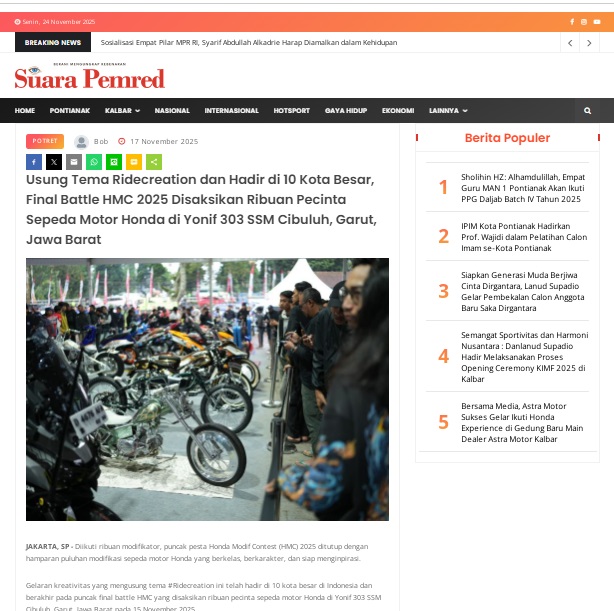 Usung Tema Ridecreation dan Hadir di 10 Kota Besar, Final Battle HMC 2025 Disaksikan Ribuan Pecinta Sepeda Motor Honda di Yonif 303 SSM Cibuluh, Garut, Jawa Barat by masmul 17 November 2025 in Silahkan kunjungi https://www.suarapemredkalbar.com/read/potret/17112025/usung-tema-ridecreation-dan-hadir-di-10-kota-besar-final-battle-hmc-2025-disaksikan-ribuan-pecinta-sepeda-motor-honda-di-yonif-303-ssm-cibuluh-garut-jawa-barat. You Might Like Regional Public Launching New ADV160 The SUV Pride Grand Launching New PCX 160 Truly Exceptional! Tetap hati-hati ya bro sist berkendara saat hujan.