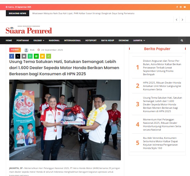 Usung Tema Satukan Hati, Satukan Semangat: Lebih dari 1.600 Dealer Sepeda Motor Honda Berikan Momen Berkesan bagi Konsumen di HPN 2025 by masmul 24 September 2025 in Silahkan kunjungi https://www.suarapemredkalbar.com/read/potret/24092025/usung-tema-satukan-hati-satukan-semangat-lebih-dari-1600-dealer-sepeda-motor-honda-berikan-momen-berkesan-bagi-konsumen-di-hpn-2025. You Might Like Regional Public Launching New ADV160 The SUV Pride Grand Launching New PCX 160 Truly Exceptional! Tetap hati-hati ya bro sist berkendara saat hujan.