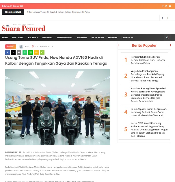 Usung Tema SUV Pride, New Honda ADV160 Hadir di Kalbar dengan Tunjukkan Gaya dan Rasakan Tenaga by masmul 30 Oktober 2025 in Silahkan kunjungi https://www.suarapemredkalbar.com/read/potret/30102025/usung-tema-suv-pride-new-honda-adv160-hadir-di-kalbar-dengan-tunjukkan-gaya-dan-rasakan-tenaga. You Might Like Regional Public Launching New ADV160 The SUV Pride Grand Launching New PCX 160 Truly Exceptional! Tetap hati-hati ya bro sist berkendara saat hujan.