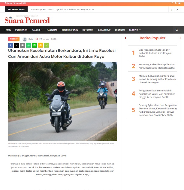Utamakan Keselamatan Berkendara, Ini Lima Resolusi Cari Aman dari Astra Motor Kalbar di Jalan Raya by masmul 28 Januari 2026 in Silahkan kunjungi https://www.suarapemredkalbar.com/read/potret/28012026/utamakan-keselamatan-berkendara-ini-lima-resolusi-cari-aman-dari-astra-motor-kalbar-di-jalan-raya. You Might Like Regional Public Launching New ADV160 The SUV Pride Grand Launching New PCX 160 Truly Exceptional! Tetap hati-hati ya bro sist berkendara saat hujan.