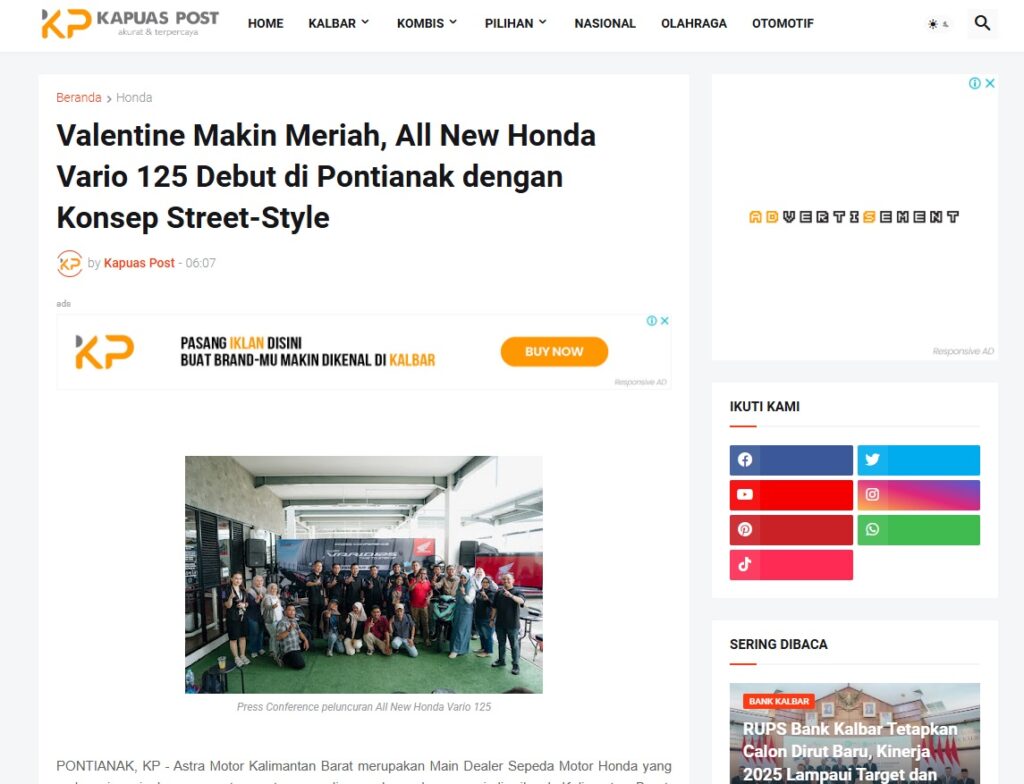 Valentine Makin Meriah, All New Honda Vario 125 Debut di Pontianak dengan Konsep Street-Style by Muhammad Arif 27 Februari 2026 in Silahkan kunjungi https://www.kapuaspost.web.id/2026/02/valentine-makin-meriah-all-new-honda_27.html. Tags: astra Astra Motor kalbar Astra Motor Pontianak astramotor honda kalbar pontianak sepeda motor You Might Like Regional Public Launching New ADV160 The SUV Pride Grand Launching New PCX 160 Truly Exceptional! Tetap hati-hati ya bro sist berkendara saat hujan.