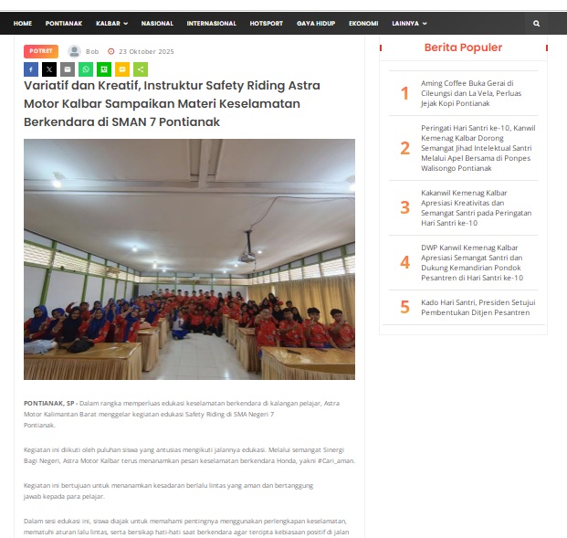 Variatif dan Kreatif, Instruktur Safety Riding Astra Motor Kalbar Sampaikan Materi Keselamatan Berkendara di SMAN 7 Pontianak by masmul 23 Oktober 2025 in Silahkan kunjungi https://www.suarapemredkalbar.com/read/potret/23102025/variatif-dan-kreatif-instruktur-safety-riding-astra-motor-kalbar-sampaikan-materi-keselamatan-berkendara-di-sman-7-pontianak. You Might Like Regional Public Launching New ADV160 The SUV Pride Grand Launching New PCX 160 Truly Exceptional! Tetap hati-hati ya bro sist berkendara saat hujan.