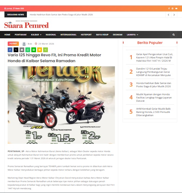 Vario 125 hingga Revo Fit, Ini Promo Kredit Motor Honda di Kalbar Selama Ramadan by masmul 23 Maret 2026 in Silahkan kunjungi https://www.suarapemredkalbar.com/read/potret/23032026/vario-125-hingga-revo-fit-ini-promo-kredit-motor-honda-di-kalbar-selama-ramadan. You Might Like Regional Public Launching New ADV160 The SUV Pride Grand Launching New PCX 160 Truly Exceptional! Tetap hati-hati ya bro sist berkendara saat hujan.