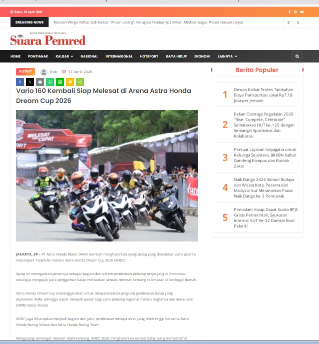 Vario 160 Kembali Siap Melesat di Arena Astra Honda Dream Cup 2026 by masmul 17 April 2026 in Silahkan kunjungi https://www.suarapemredkalbar.com/read/potret/17042026/vario-160-kembali-siap-melesat-di-arena-astra-honda-dream-cup-2026. You Might Like Regional Public Launching New ADV160 The SUV Pride Grand Launching New PCX 160 Truly Exceptional! Tetap hati-hati ya bro sist berkendara saat hujan.