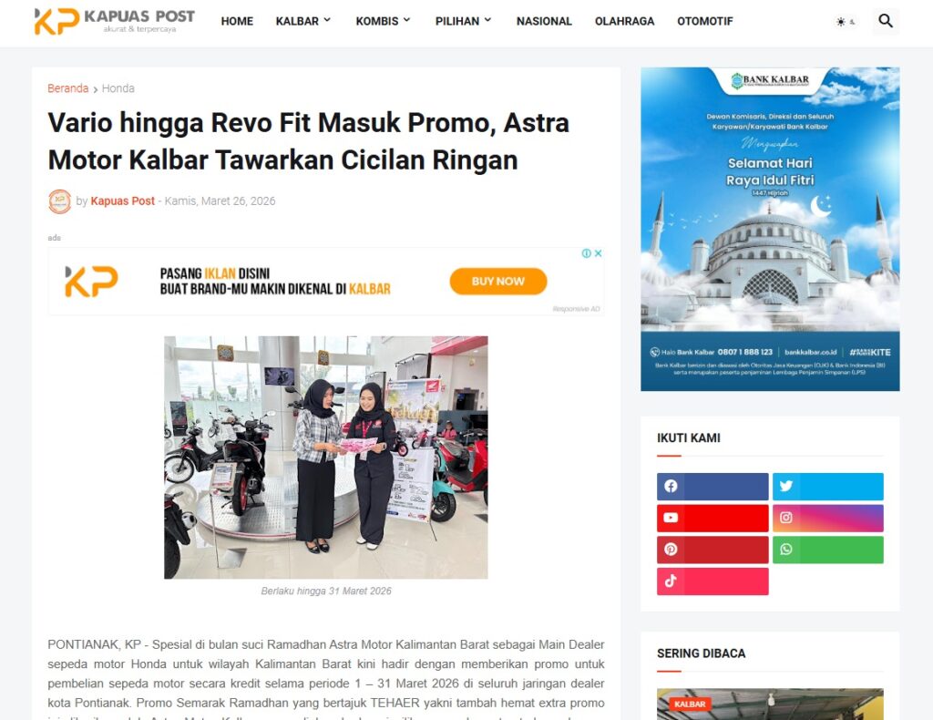 Vario hingga Revo Fit Masuk Promo, Astra Motor Kalbar Tawarkan Cicilan Ringan by Muhammad Arif 26 Maret 2026 in Silahkan kunjungi https://www.kapuaspost.web.id/2026/03/vario-hingga-revo-fit-masuk-promo-astra.html. Tags: astra Astra Motor kalbar Astra Motor Pontianak astramotor honda kalbar pontianak sepeda motor You Might Like Regional Public Launching New ADV160 The SUV Pride Grand Launching New PCX 160 Truly Exceptional! Tetap hati-hati ya bro sist berkendara saat hujan.