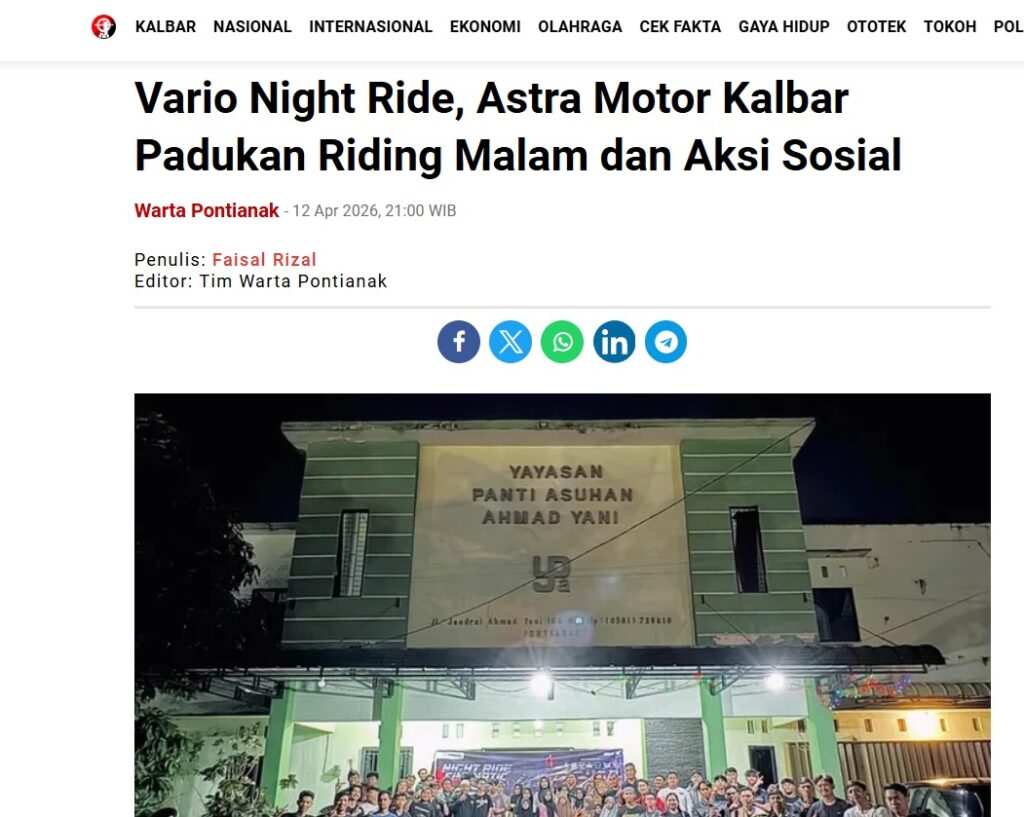Vario Night Ride, Astra Motor Kalbar Padukan Riding Malam dan Aksi Sosial by Faisal Rizal 12 April 2026 in Silahkan kunjungi https://wartapontianak.pikiran-rakyat.com/gaya-hidup/pr-11710134481/vario-night-ride-astra-motor-kalbar-padukan-riding-malam-dan-aksi-sosial. You Might Like Regional Public Launching New ADV160 The SUV Pride Grand Launching New PCX 160 Truly Exceptional! Tetap hati-hati ya bro sist berkendara saat hujan.